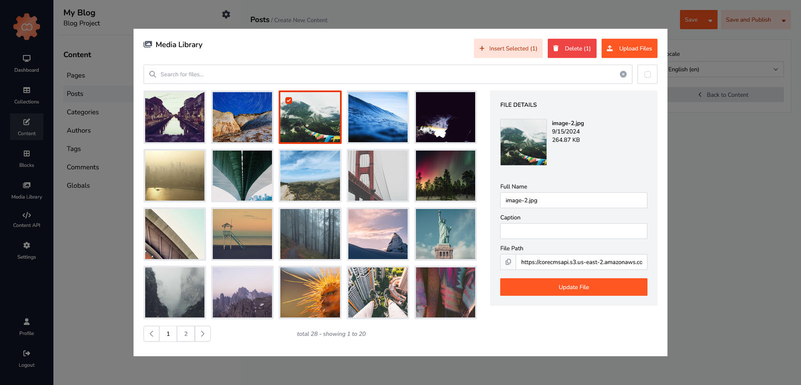 Manage your assets with ease with our powerful Media library. Choose between your local disk storage or AWS S3.
